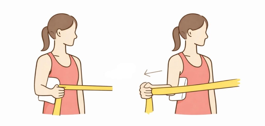- 肘を体の横につける(タオルを挟むと◎)