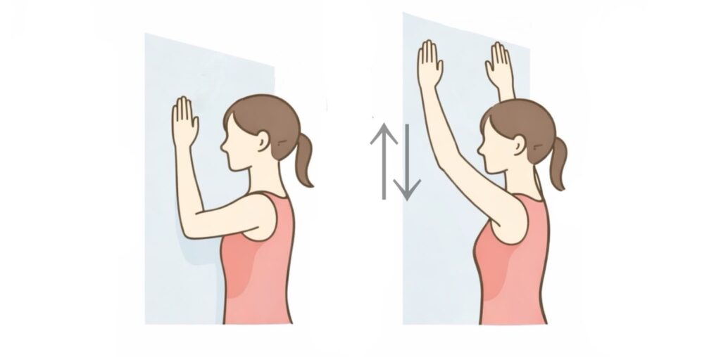 壁スライドは、肩に強い負荷をかけずに可動域を少しずつ取り戻すためのエクササイズです。壁を使うことで肩甲骨と肩関節の動きを安全に引き出しながら、回復期の肩を無理なく動かすことができます。