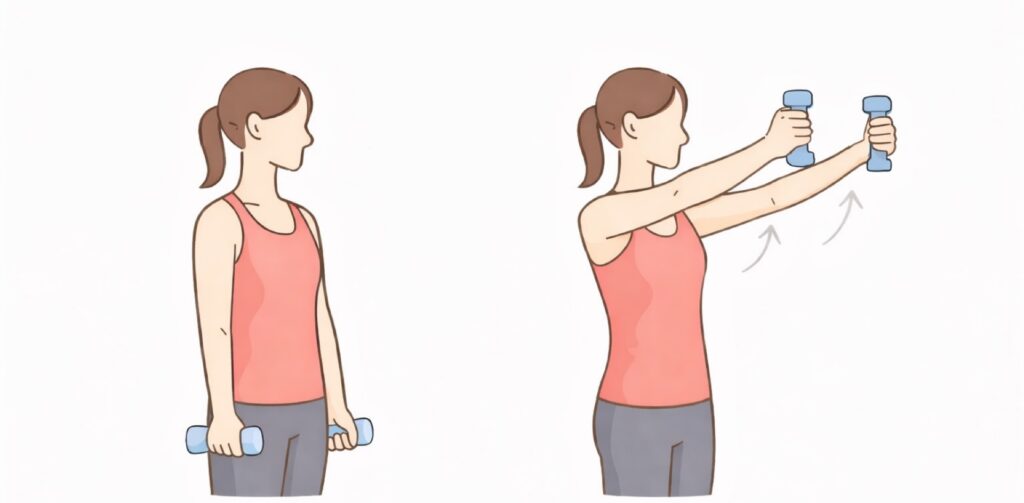 ④ 軽量ダンベル前方挙上(最終段階)