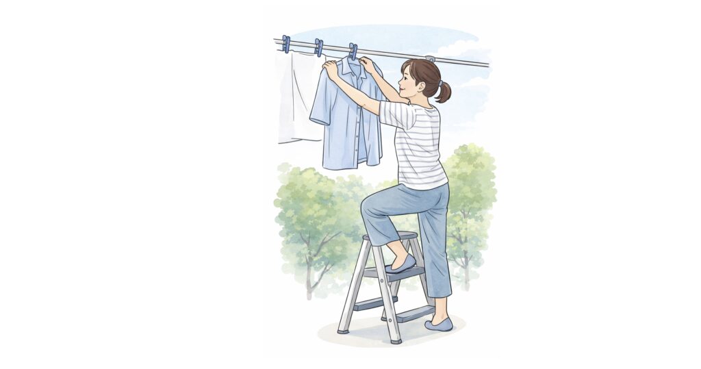 離れたところから腕を伸ばすのではなく、体を物干しに近づけた上で踏み台を使う。ポイントは体を近づけることです。