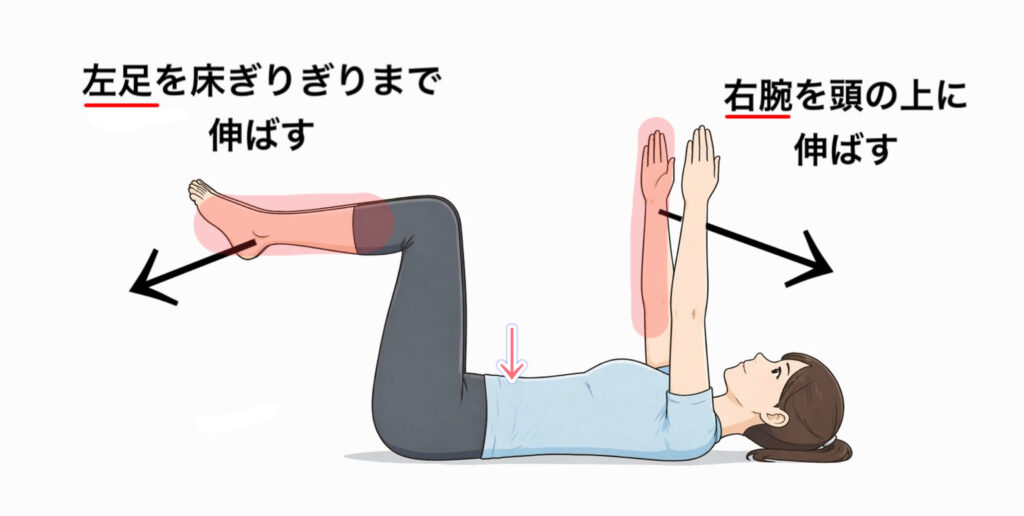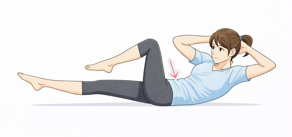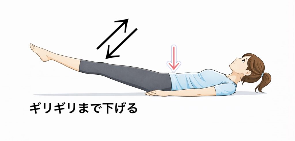 最初は可動域を小さくし、「お腹を薄く保ったまま戻れる範囲」で行いましょう。戻るときにお腹を使う意識を持つと、下腹に効きやすくなります。