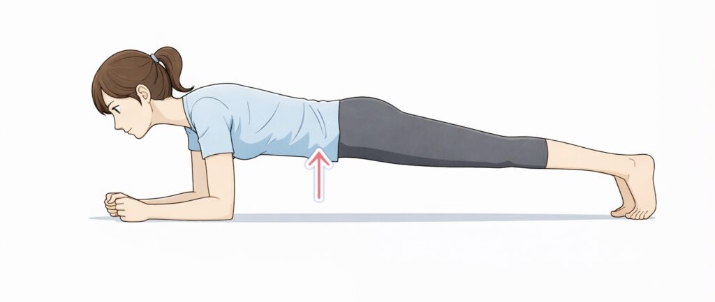 体を一直線にすることよりも下腹が使えているかを優先してください。下腹が使えていれば、腰が少し上がっていても大丈夫です。